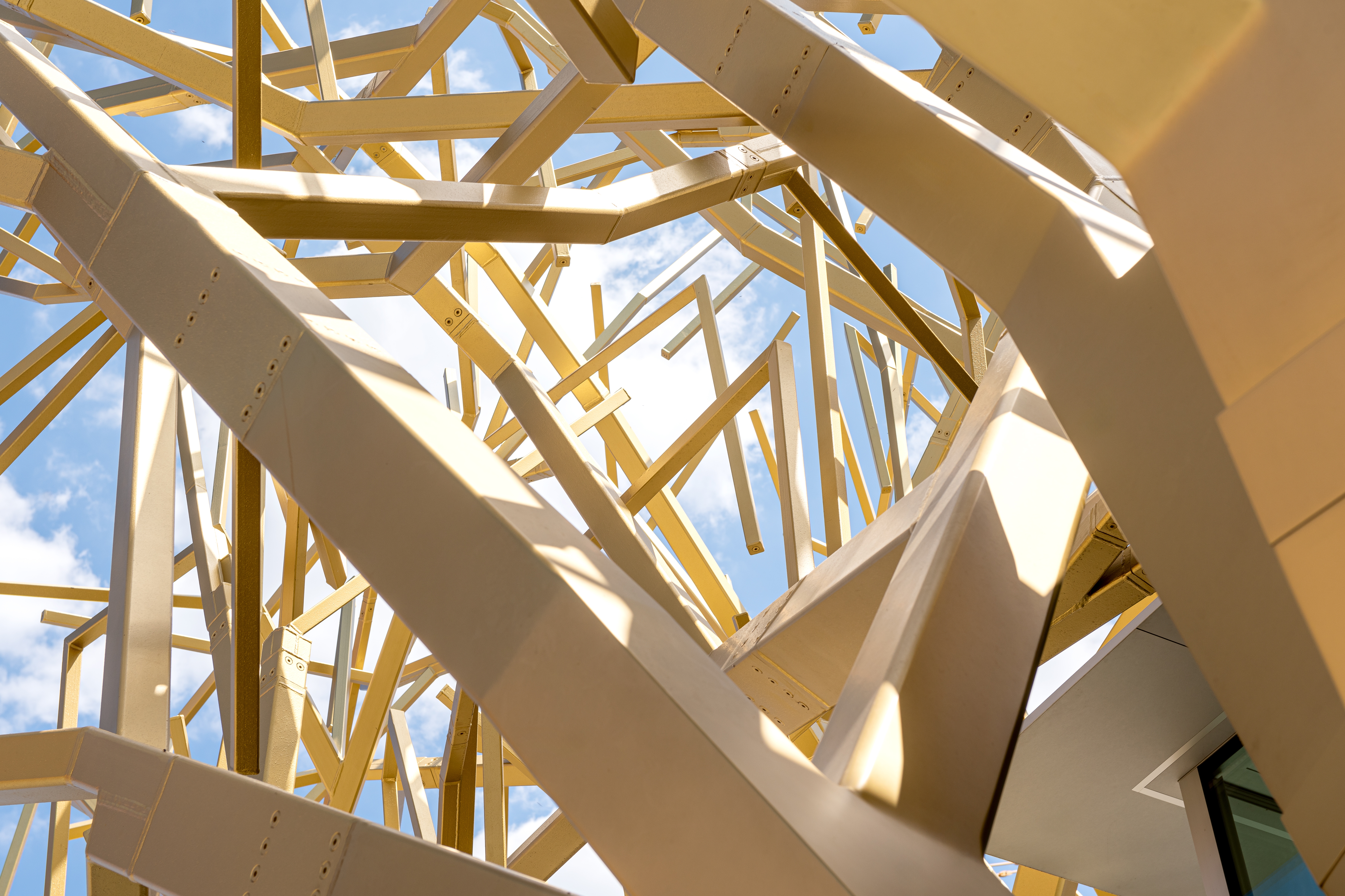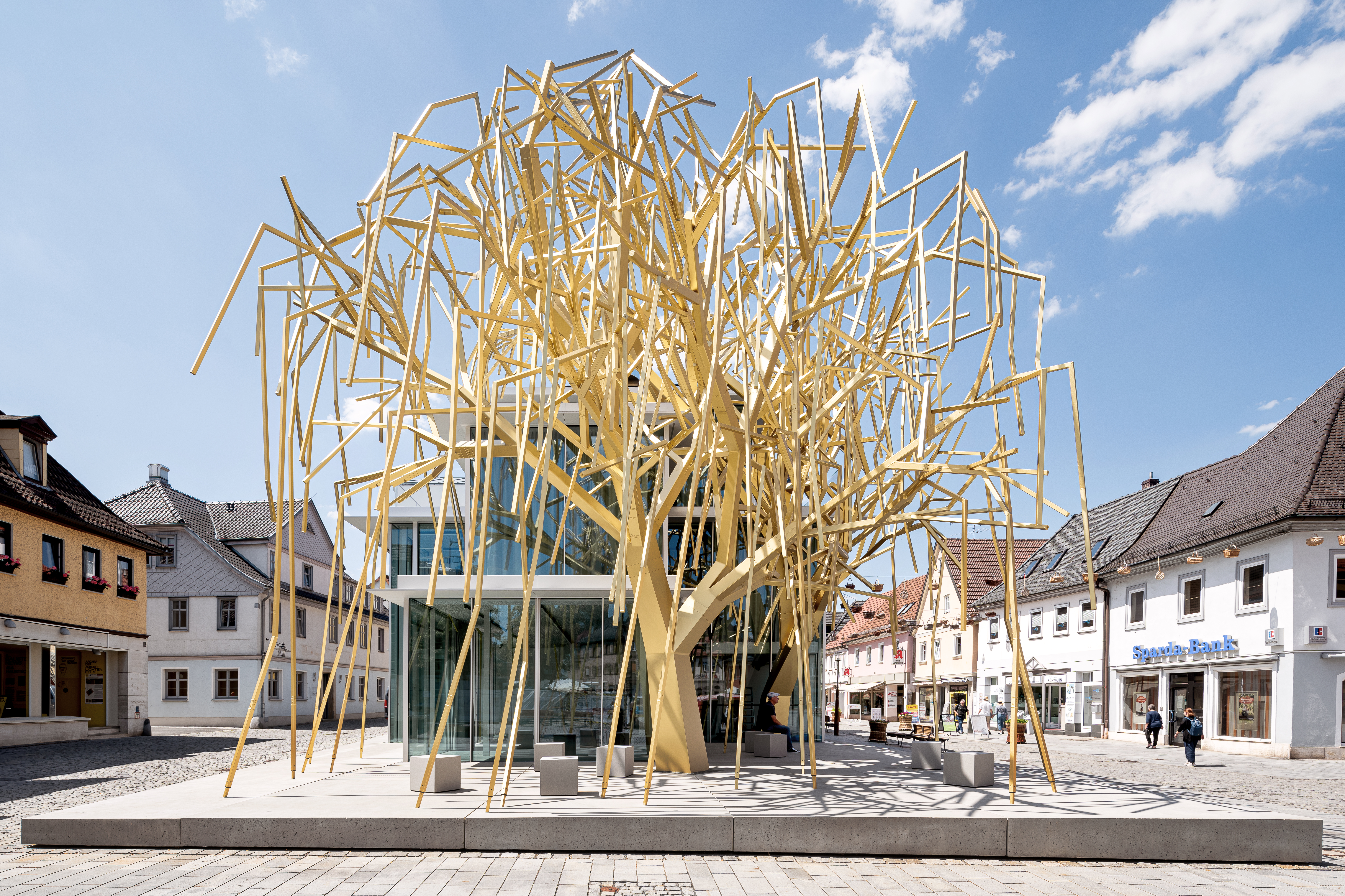 Die metallenen Äste beugen sich herab und bilden in Analogie zu den Arkaden historischer Städte einen lichten Stadtraum.